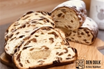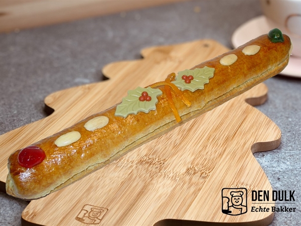 Feestelijk verpakt pakket gevuld met een kleine kerststol een kerststaaf en kerst-koekkransjes